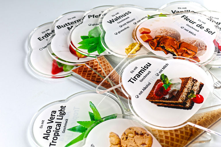 Verleihen Sie Ihrer Eistheke das gewisse Etwas mit unseren hochwertigen Eissorten-Markern. Diese extrem stabilen Schilder werden direkt in die Eisbehälter gesteckt und präsentieren Ihren Kunden auf ansprechende Weise, welche köstlichen Sorten Sie anbieten. Machen Sie Schluss mit provisorischen Beschriftungen und setzen Sie auf Qualität und Stil. Sie sind gekennzeichnet mit allen Zusatzstoffen (wie gesetzlich vorgeschrieben). Mit unseren Eissorten-Markern wird jeder Besuch in Ihrer Eisdiele zu einem optischen und geschmacklichen Erlebnis!